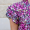 Elevate your style with our Multi Leopard Top featuring ruffle sleeves. Made from 80% rayon and 20% polyester, this top combines comfort and luxury. The model is wearing a size Small, showcasing the perfect fit. Perfect for any occasion, this top is a must-have for your wardrobe.